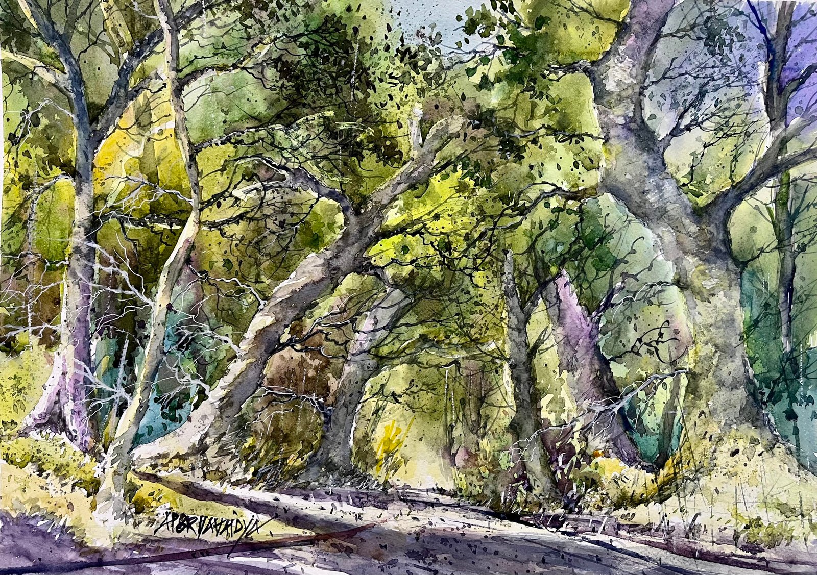 The painting depicts the mid morning light in the Dandeli forest, in north of Karnataka, India. It captures a serene and inviting woodland scene, evoking a sense of tranquility and peace.