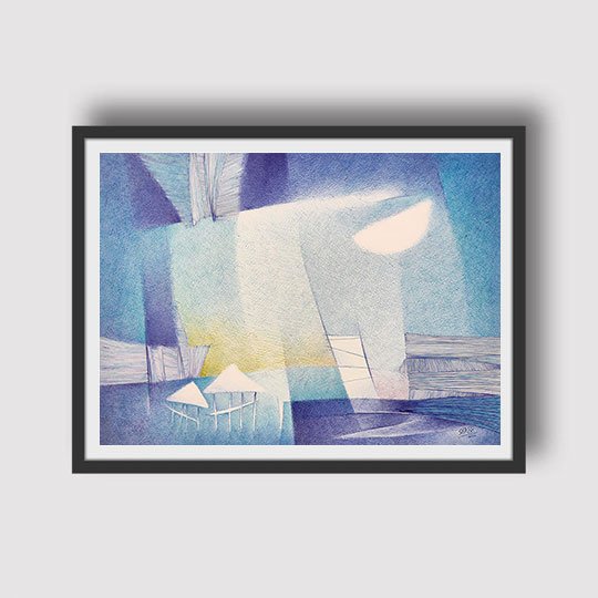 Shirish Deshpande / Tranquil Blues / Size 14 x 20 inches / Ballpoint pens on Handmade paper